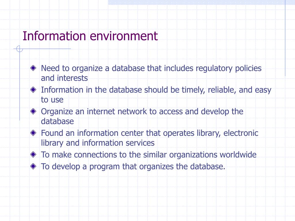 Information environment • Need to organize a database that includes regulatory policies and interests • Information in the database should be timely, reliable, and easy to use • Organize an internet network to access and develop the database • Found an information center that operates library, electronic library and information services • To make connections to the similar organizations worldwide • To develop a program that organizes the database.