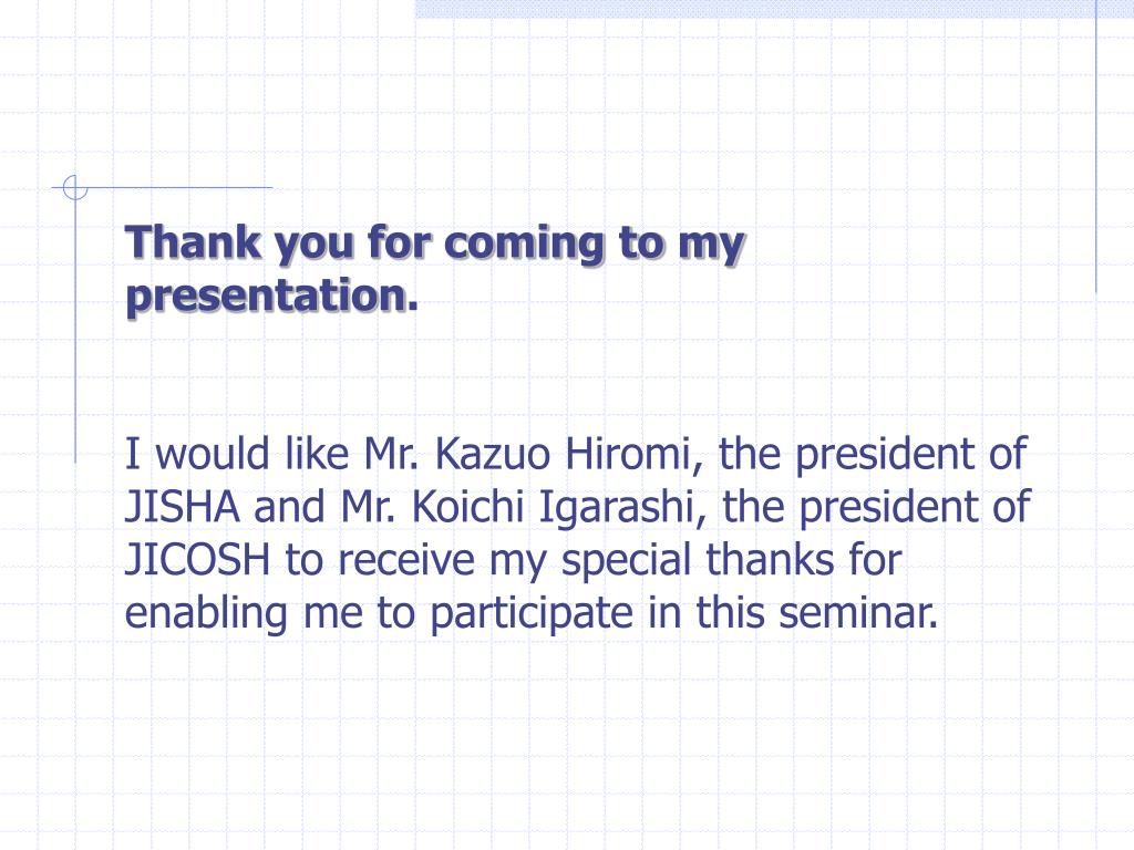 Thank you for coming to my presentation. I would like Mr. Kazuo Hiromi, the president of JISHA and Mr. Koichi Igarashi, the president of JICOSH to receive my special thanks for enabling me to participate in this seminar.