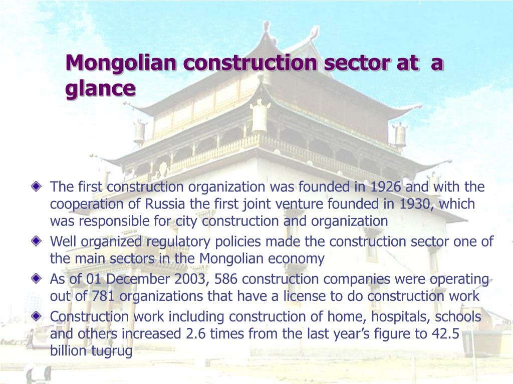 Mongolian construction sector at a glance The first construction organization was founded in 1926 and with the cooperation of Russia the first joint venture founded in 1930, which was responsible for city construction and organization Well organized regulatory policies made the construction sector one of the main sectors in the Mongolian economy As of 01 December 2003, 586 construction companies were operating out of 781 organizations that have a license to do construction work Construction work including construction of home, hospitals, schools and others increased 2.6 times from the last year’s figure to 42.5 billion tugrug