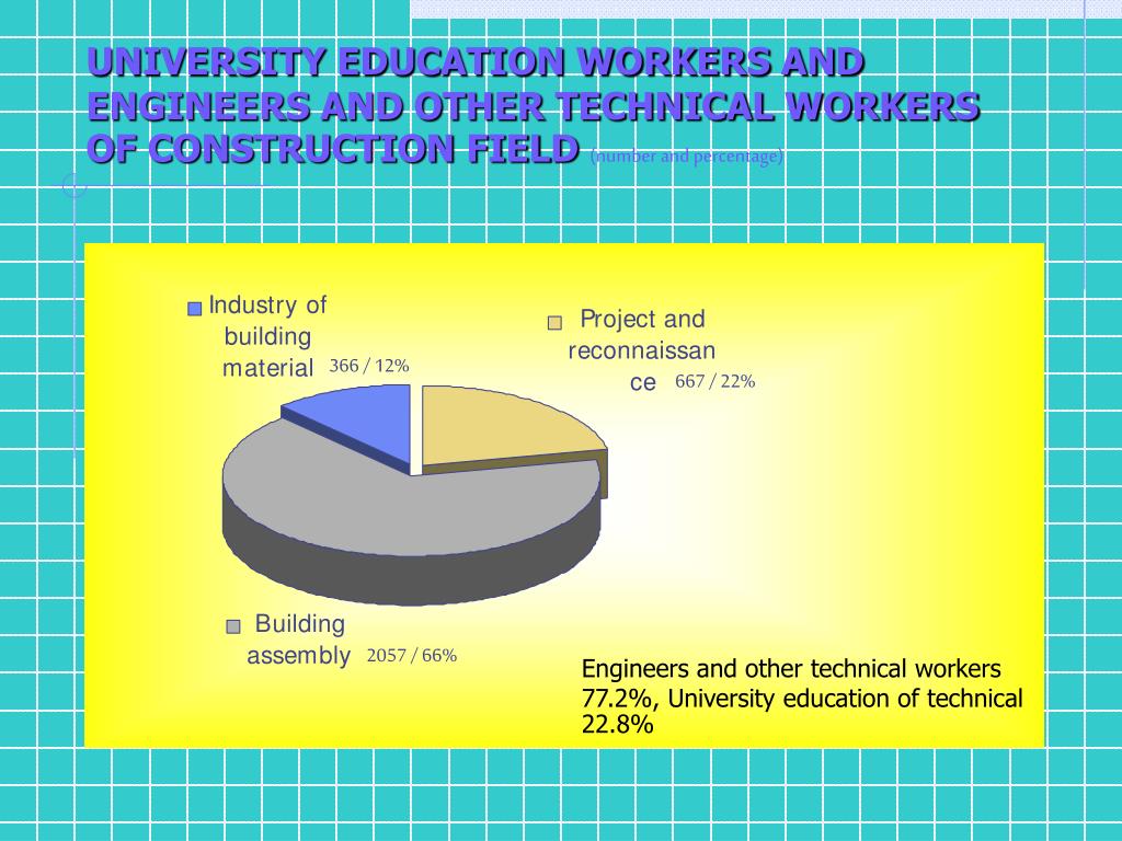 UNIVERSITY EDUCATION WORKERS AND ENGINEERS AND OTHER TECHNICAL WORKERS OF CONSTRUCTION FIELD (number and percentage) 366 / 12% 667 / 22% Engineers and other technical workers 77.2%, University education of technical 22.8% 2057 / 66%