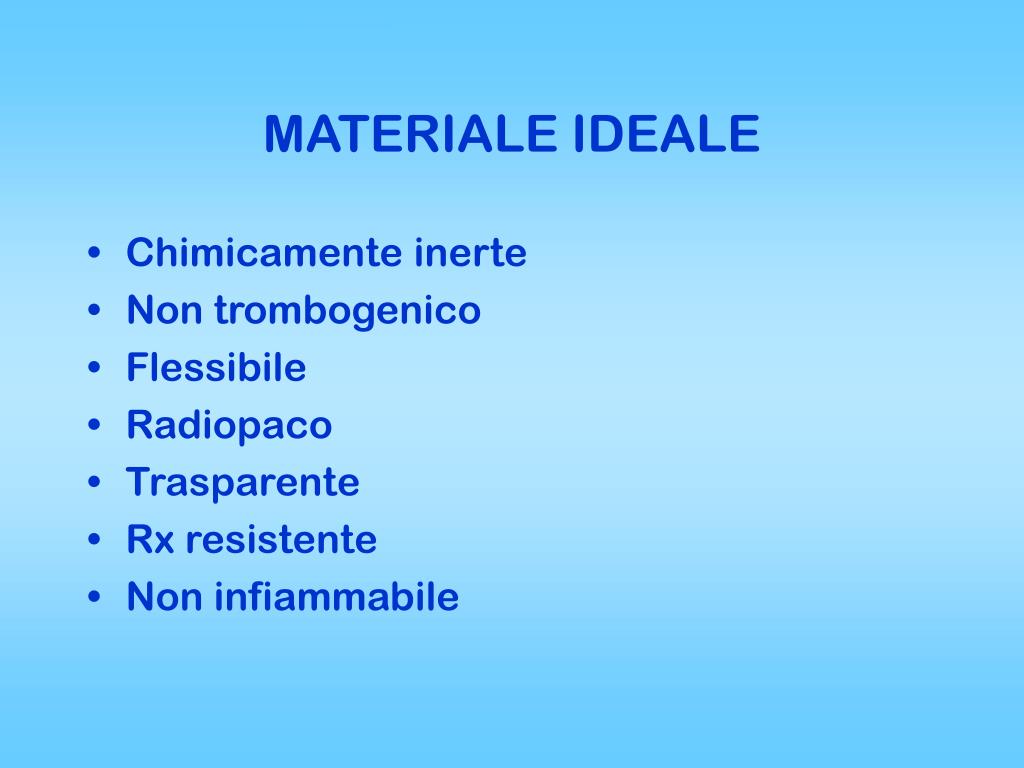 MATERIALE IDEALE • Chimicamente inerte • Non trombogenico • Flessibile • Radiopaco • Trasparente • Rx resistente • Non infiammabile
