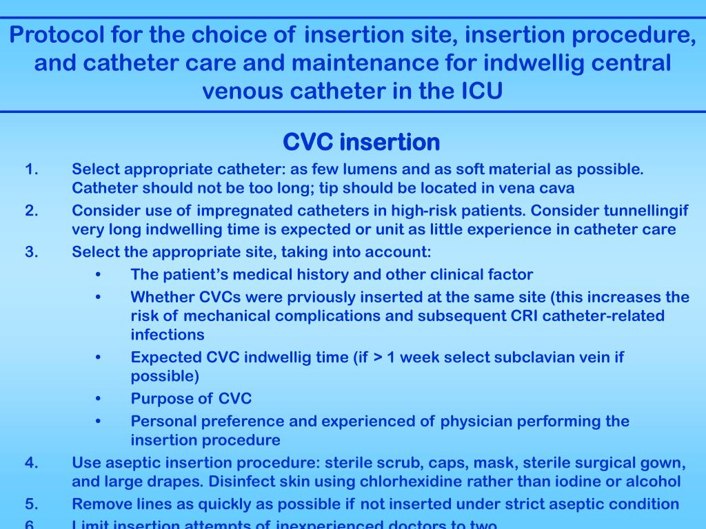 Protocol for the choice of insertion site, insertion procedure, and catheter care and maintenance for indwellig central venous catheter in the ICU CVC insertion • Select appropriate catheter: as few lumens and as soft material as possible. Catheter should not be too long; tip should be located in vena cava • Consider use of impregnated catheters in high-risk patients. Consider tunnellingif very long indwelling time is expected or unit as little experience in catheter care • Select the appropriate site, taking into account: • The patient’s medical history and other clinical factor • Whether CVCs were prviously inserted at the same site (this increases the risk of mechanical complications and subsequent CRI catheter-related infections • Expected CVC indwellig time (if > 1 week select subclavian vein if possible) • Purpose of CVC • Personal preference and experienced of physician performing the insertion procedure • Use aseptic insertion procedure: sterile scrub, caps, mask, sterile surgical gown, and large drapes. Disinfect skin using chlorhexidine rather than iodine or alcohol • Remove lines as quickly as possible if not inserted under strict aseptic condition • Limit insertion attempts of inexperienced doctors to two