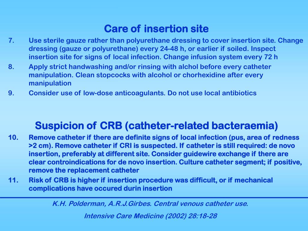 Care of insertion site • Use sterile gauze rather than polyurethane dressing to cover insertion site. Change dressing (gauze or polyurethane) every 24-48 h, or earlier if soiled. Inspect insertion site for signs of local infection. Change infusion system every 72 h • Apply strict handwashing and/or rinsing with alchol before every catheter manipulation. Clean stopcocks with alcohol or chorhexidine after every manipulation • Consider use of low-dose anticoagulants. Do not use local antibiotics Suspicion of CRB (catheter-related bacteraemia) • Remove catheter if there are definite signs of local infection (pus, area of redness >2 cm). Remove catheter if CRI is suspected. If catheter is still required: de novo insertion, preferably at different site. Consider guidewire exchange if there are clear controindications for de novo insertion. Culture catheter segment; if positive, remove the replacement catheter • Risk of CRB is higher if insertion procedure was difficult, or if mechanical complications have occured durin insertion K.H. Polderman, A.R.J.Girbes. Central venous catheter use. Intensive Care Medicine (2002) 28:18-28