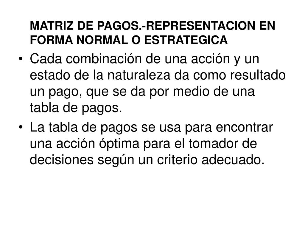 MATRIZ DE PAGOS.-REPRESENTACION EN FORMA NORMAL O ESTRATEGICA • Cada combinación de una acción y un estado de la naturaleza da como resultado un pago, que se da por medio de una tabla de pagos. • La tabla de pagos se usa para encontrar una acción óptima para el tomador de decisiones según un criterio adecuado.