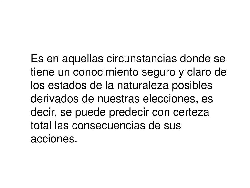 Es en aquellas circunstancias donde se tiene un conocimiento seguro y claro de los estados de la naturaleza posibles derivados de nuestras elecciones, es decir, se puede predecir con certeza total las consecuencias de sus acciones.
