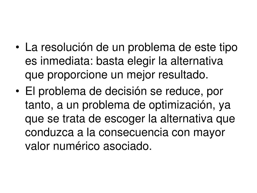 La resolución de un problema de este tipo es inmediata: basta elegir la alternativa que proporcione un mejor resultado. • El problema de decisión se reduce, por tanto, a un problema de optimización, ya que se trata de escoger la alternativa que conduzca a la consecuencia con mayor valor numérico asociado.