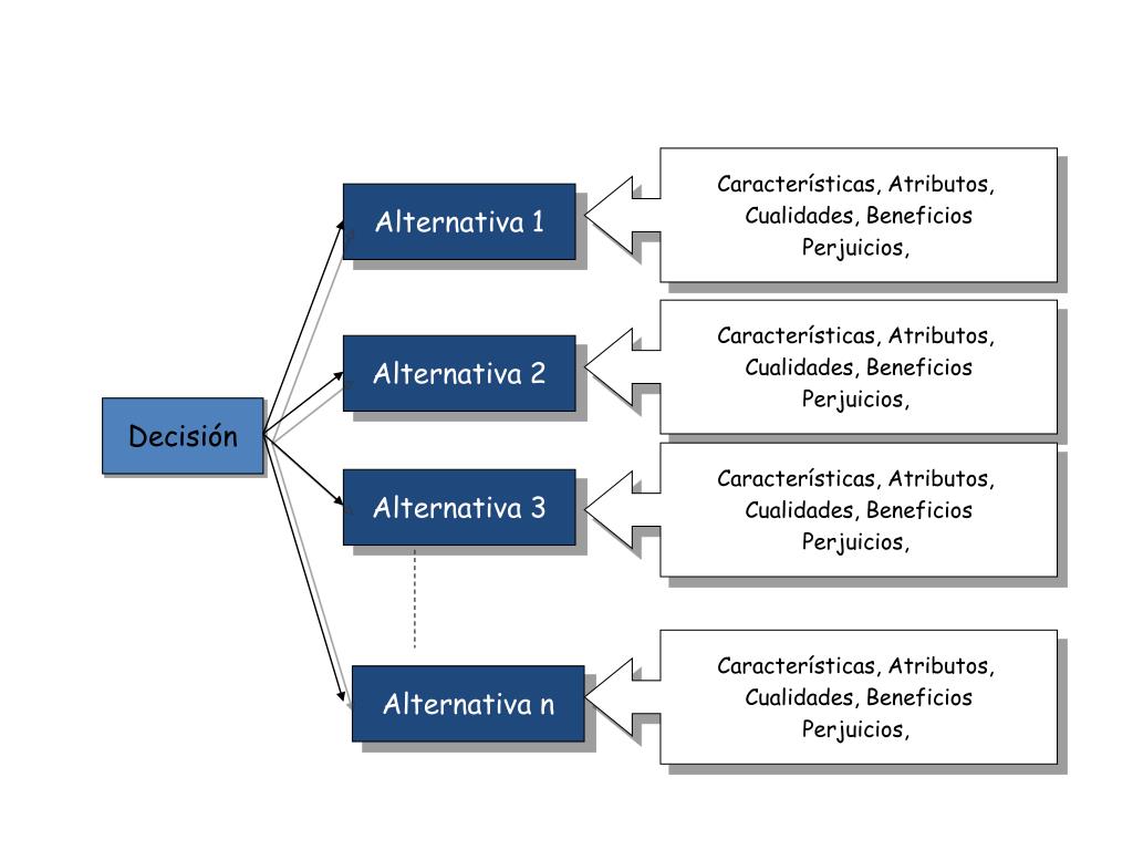Características, Atributos, Cualidades, Beneficios Perjuicios, Alternativa 1 Características, Atributos, Cualidades, Beneficios Perjuicios, Alternativa 2 Decisión Características, Atributos, Cualidades, Beneficios Perjuicios, Alternativa3 Características, Atributos, Cualidades, Beneficios Perjuicios, Alternativan