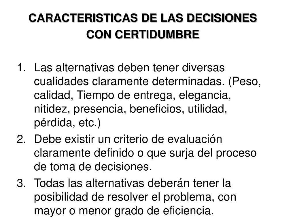 CARACTERISTICAS DE LAS DECISIONES CON CERTIDUMBRE • Las alternativas deben tener diversas cualidades claramente determinadas. (Peso, calidad, Tiempo de entrega, elegancia, nitidez, presencia, beneficios, utilidad, pérdida, etc.) • Debe existir un criterio de evaluación claramente definido o que surja del proceso de toma de decisiones. • Todas las alternativas deberán tener la posibilidad de resolver el problema, con mayor o menor grado de eficiencia.