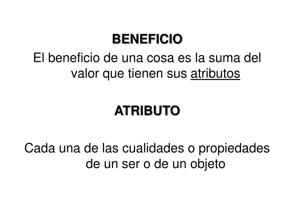 BENEFICIO El beneficio de una cosa es la suma del valor que tienen sus atributos ATRIBUTO Cada una de las cualidades o propiedades de un ser o de un objeto