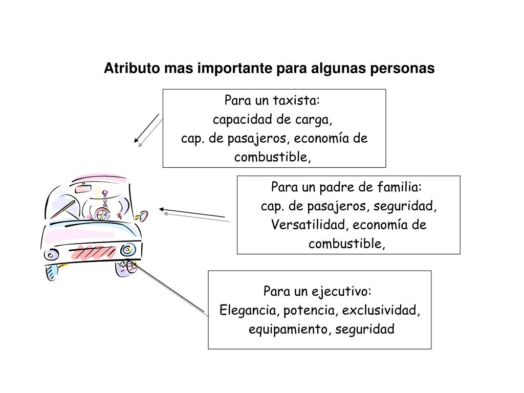 Atributo mas importante para algunas personas Para un taxista: capacidad de carga, cap. de pasajeros, economía de combustible, Para un padre de familia: cap. de pasajeros, seguridad, Versatilidad, economía de combustible, Para un ejecutivo: Elegancia, potencia, exclusividad, equipamiento, seguridad
