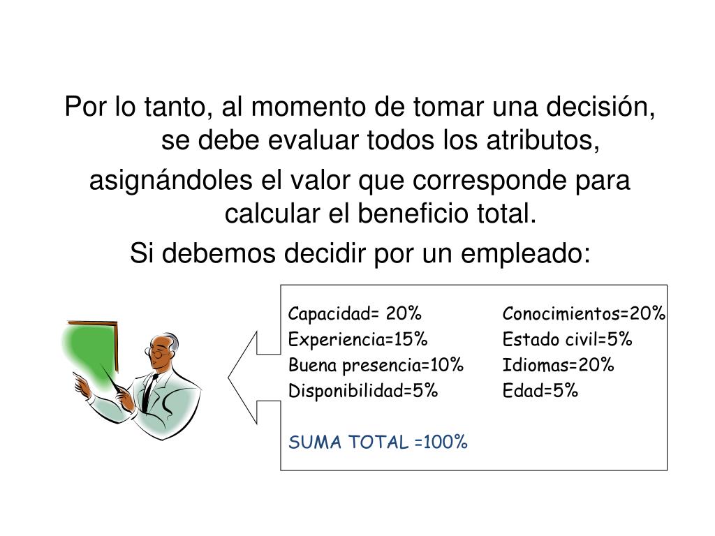 Por lo tanto, al momento de tomar una decisión, se debe evaluar todos los atributos, asignándoles el valor que corresponde para calcular el beneficio total. Si debemos decidir por un empleado: Capacidad= 20% Conocimientos=20% Experiencia=15% Estado civil=5% Buena presencia=10% Idiomas=20% Disponibilidad=5% Edad=5% SUMA TOTAL =100%