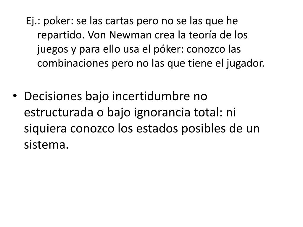 Ej.: poker: se las cartas pero no se las que he repartido. Von Newman crea la teoría de los juegos y para ello usa el póker: conozco las combinaciones pero no las que tiene el jugador. • Decisiones bajo incertidumbre no estructurada o bajo ignorancia total: ni siquiera conozco los estados posibles de un sistema.