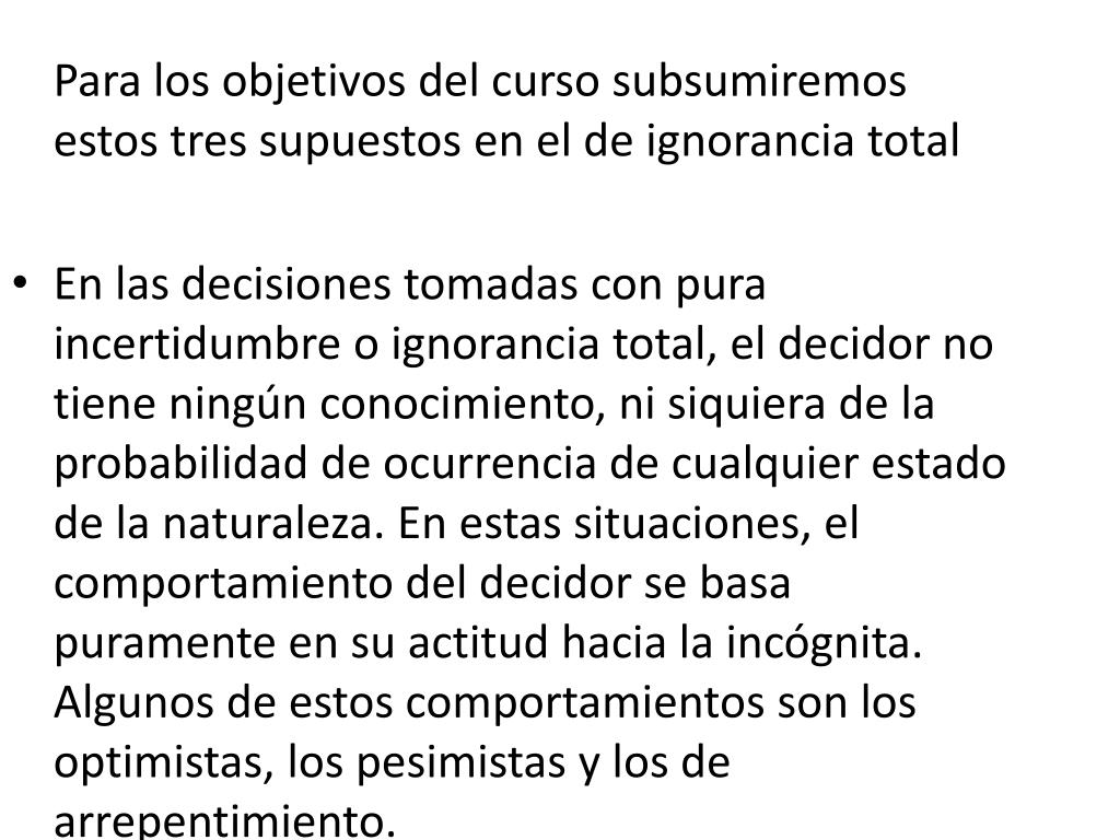 Para los objetivos del curso subsumiremos estos tres supuestos en el de ignorancia total • En las decisiones tomadas con pura incertidumbre o ignorancia total, el decidor no tiene ningún conocimiento, ni siquiera de la probabilidad de ocurrencia de cualquier estado de la naturaleza. En estas situaciones, el comportamiento del decidor se basa puramente en su actitud hacia la incógnita. Algunos de estos comportamientos son los optimistas, los pesimistas y los de arrepentimiento.
