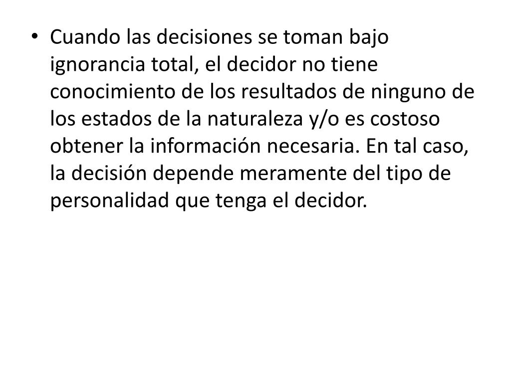 Cuando las decisiones se toman bajo ignorancia total, el decidor no tiene conocimiento de los resultados de ninguno de los estados de la naturaleza y/o es costoso obtener la información necesaria. En tal caso, la decisión depende meramente del tipo de personalidad que tenga el decidor.
