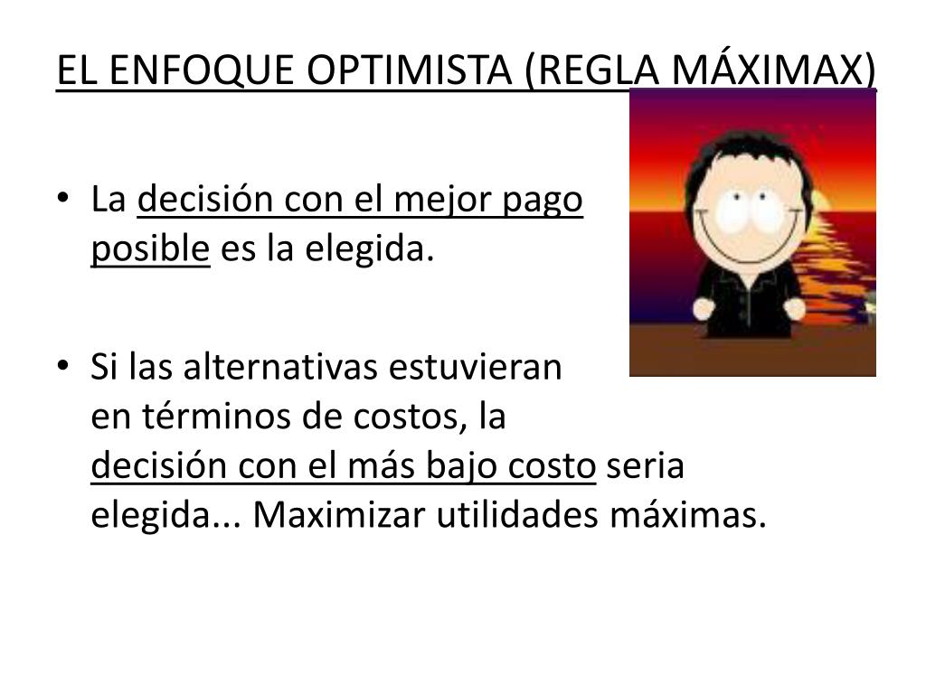 EL ENFOQUE OPTIMISTA (REGLA MÁXIMAX) • La decisión con el mejor pago posible es la elegida. • Si las alternativas estuvieran en términos de costos, la decisión con el más bajo costo seria elegida... Maximizar utilidades máximas.