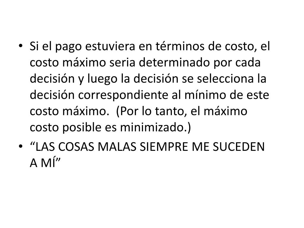 Si el pago estuviera en términos de costo, el costo máximo seria determinado por cada decisión y luego la decisión se selecciona la decisión correspondiente al mínimo de este costo máximo. (Por lo tanto, el máximo costo posible es minimizado.) • “LAS COSAS MALAS SIEMPRE ME SUCEDEN A MÍ”