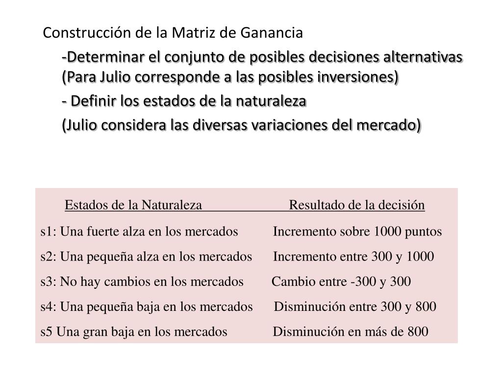 Construcción de la Matriz de Ganancia -Determinar el conjunto de posibles decisiones alternativas (Para Julio corresponde a las posibles inversiones) - Definir los estados de la naturaleza (Julio considera las diversas variaciones del mercado) Estados de la Naturaleza Resultado de la decisión s1: Una fuerte alza en los mercados Incremento sobre 1000 puntos s2: Una pequeña alza en los mercados Incremento entre 300 y 1000 s3: No hay cambios en los mercados Cambio entre -300 y 300 s4: Una pequeña baja en los mercados Disminución entre 300 y 800 s5 Una gran baja en los mercados Disminución en más de 800