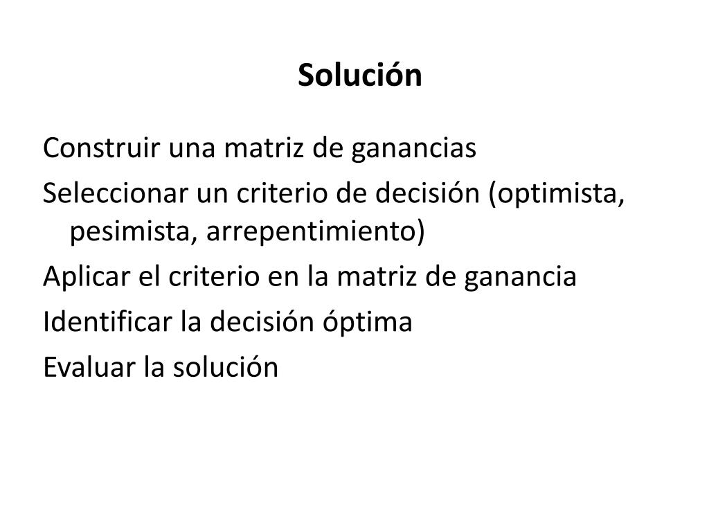Solución Construir una matriz de ganancias Seleccionar un criterio de decisión (optimista, pesimista, arrepentimiento) Aplicar el criterio en la matriz de ganancia Identificar la decisión óptima Evaluar la solución