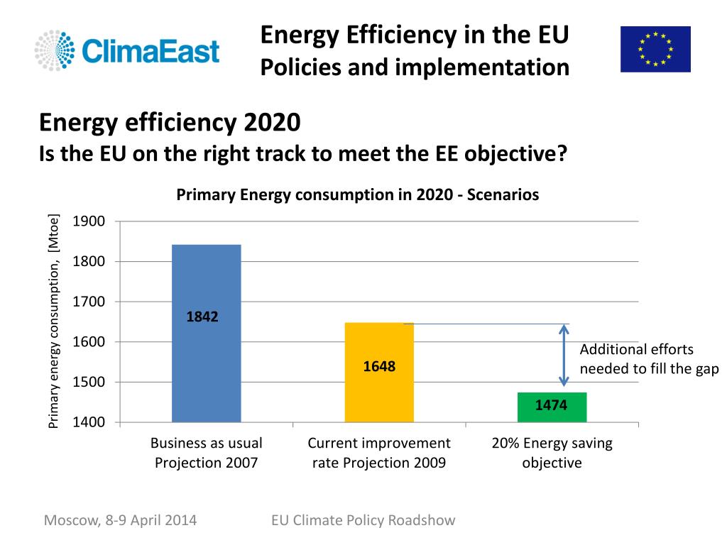 Energy Efficiency in the EU Policies and implementation Energy efficiency 2020 Is the EU on the righttrack to meetthe EE objective? Primaryenergy consumption, [Mtoe] Additionaleffortsneeded to fill the gap EU Climate Policy Roadshow