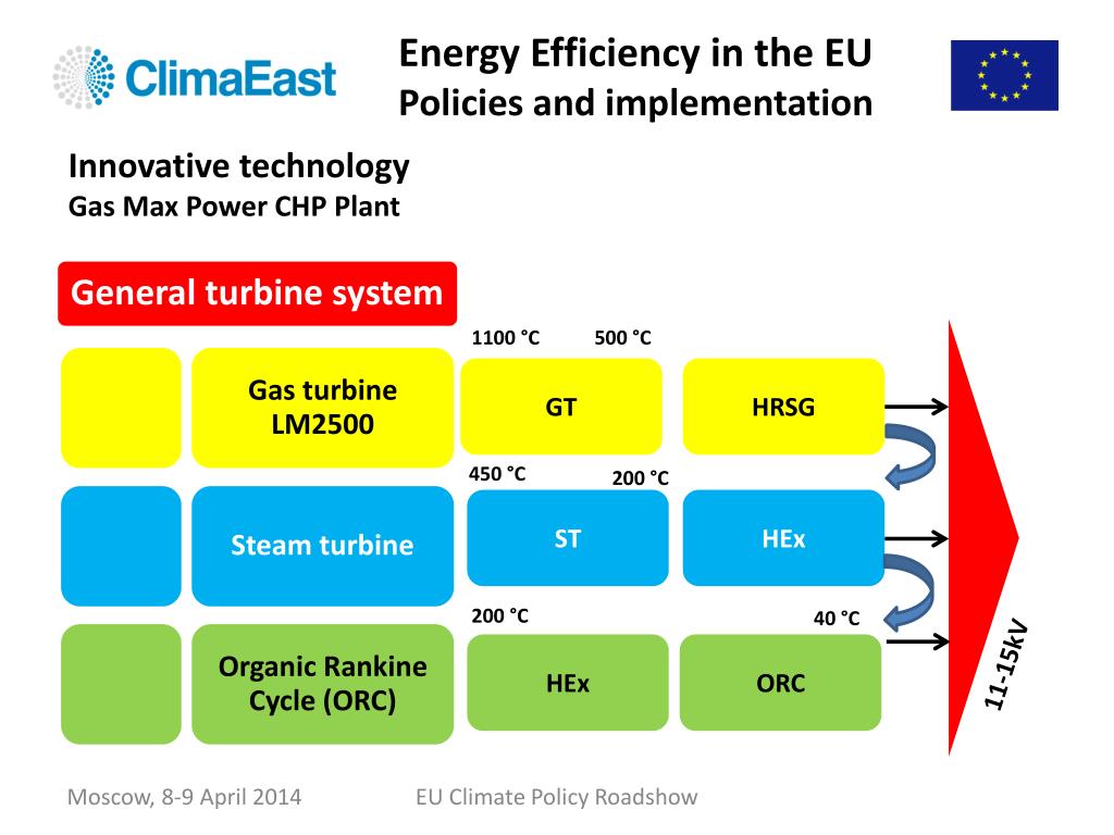Energy Efficiency in the EU Policies and implementation Innovative technology Gas Max Power CHP Plant 1100 °C 500 °C GT HRSG 450 °C 200 °C ST HEx 200 °C 40 °C HEx ORC 11-15kV EU Climate Policy Roadshow