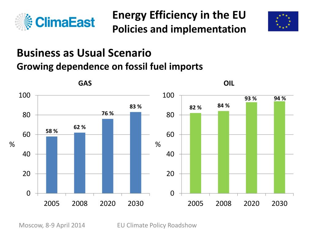Energy Efficiency in the EU Policies and implementation Business as UsualScenarioGrowingdependence on fossilfuelimports % % EU Climate Policy Roadshow