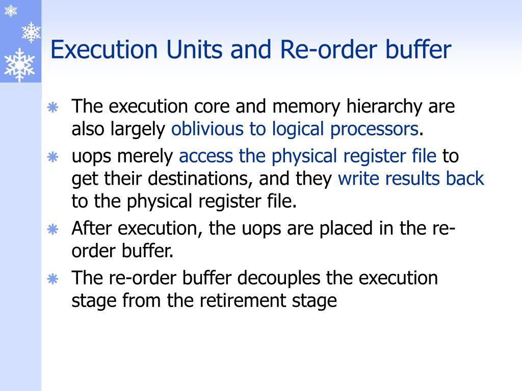 Execution Units and Re-order buffer • The execution core and memory hierarchy are also largely oblivious to logical processors. • uops merely access the physical register file to get their destinations, and they write results back to the physical register file. • After execution, the uops are placed in the re-order buffer. • The re-order buffer decouples the execution stage from the retirement stage