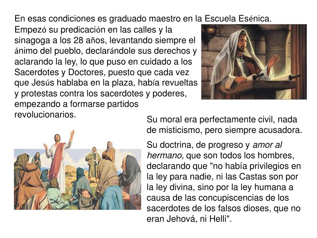 En esas condiciones es graduado maestro en la Escuela Esénica. Empezó su predicación en las calles y la sinagoga a los 28 años, levantando siempre el ánimo del pueblo, declarándole sus derechos y aclarando la ley, lo que puso en cuidado a los Sacerdotes y Doctores, puesto que cada vez que Jesús hablaba en la plaza, había revueltas y protestas contra los sacerdotes y poderes, empezando a formarse partidos revolucionarios. Su moral era perfectamente civil, nada de misticismo, pero siempre acusadora. Su doctrina, de progreso y amor al hermano, que son todos los hombres, declarando que "no había privilegios en la ley para nadie, ni las Castas son por la ley divina, sino por la ley humana a causa de las concupiscencias de los sacerdotes de los falsos dioses, que no eran Jehová, ni Helli".