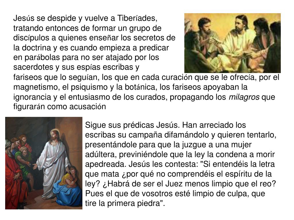 Jesús se despide y vuelve a Tiberíades, tratando entonces de formar un grupo de discípulos a quienes enseñar los secretos de la doctrina y es cuando empieza a predicar en parábolas para no ser atajado por los sacerdotes y sus espías escribas y fariseos que lo seguían, los que en cada curación que se le ofrecía, por el magnetismo, el psiquismo y la botánica, los fariseos apoyaban la ignorancia y el entusiasmo de los curados, propagando los milagros que figurarán como acusación Sigue sus prédicas Jesús. Han arreciado los escribas su campaña difamándolo y quieren tentarlo, presentándole para que la juzgue a una mujer adúltera, previniéndole que la ley la condena a morir apedreada. Jesús les contesta: "Si entendéis la letra que mata ¿por qué no comprendéis el espíritu de la ley? ¿Habrá de ser el Juez menos limpio que el reo? Pues el que de vosotros esté limpio de culpa, que tire la primera piedra".
