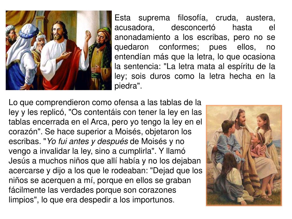 Esta suprema filosofía, cruda, austera, acusadora, desconcertó hasta el anonadamiento a los escribas, pero no se quedaron conformes; pues ellos, no entendían más que la letra, lo que ocasiona la sentencia: "La letra mata al espíritu de la ley; sois duros como la letra hecha en la piedra". Lo que comprendieron como ofensa a las tablas de la ley y les replicó, "Os contentáis con tener la ley en las tablas encerrada en el Arca, pero yo tengo la ley en el corazón". Se hace superior a Moisés, objetaron los escribas. "Yo fui antes y después de Moisés y no vengo a invalidar la ley, sino a cumplirla". Y llamó Jesús a muchos niños que allí había y no los dejaban acercarse y dijo a los que le rodeaban: "Dejad que los niños se acerquen a mí, porque en ellos se graban fácilmente las verdades porque son corazones limpios", lo que era despedir a los importunos.