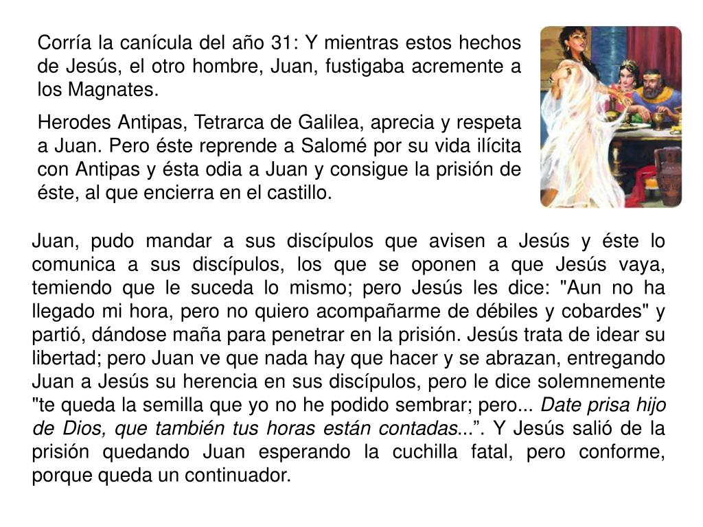 Corría la canícula del año 31: Y mientras estos hechos de Jesús, el otro hombre, Juan, fustigaba acremente a los Magnates. Herodes Antipas, Tetrarca de Galilea, aprecia y respeta a Juan. Pero éste reprende a Salomé por su vida ilícita con Antipas y ésta odia a Juan y consigue la prisión de éste, al que encierra en el castillo. Juan, pudo mandar a sus discípulos que avisen a Jesús y éste lo comunica a sus discípulos, los que se oponen a que Jesús vaya, temiendo que le suceda lo mismo; pero Jesús les dice: "Aun no ha llegado mi hora, pero no quiero acompañarme de débiles y cobardes" y partió, dándose maña para penetrar en la prisión. Jesús trata de idear su libertad; pero Juan ve que nada hay que hacer y se abrazan, entregando Juan a Jesús su herencia en sus discípulos, pero le dice solemnemente "te queda la semilla que yo no he podido sembrar; pero... Date prisa hijo de Dios, que también tus horas están contadas...”. Y Jesús salió de la prisión quedando Juan esperando la cuchilla fatal, pero conforme, porque queda un continuador.