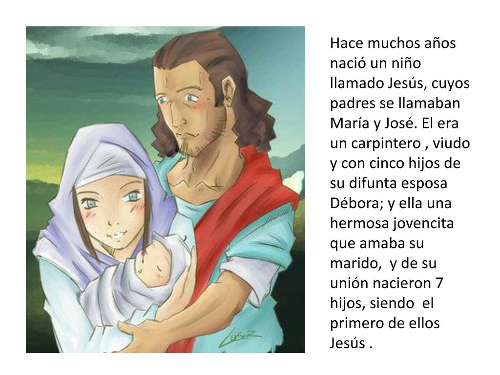 Hace muchos años nació un niño llamado Jesús, cuyos padres se llamaban María y José. El era un carpintero , viudo y con cinco hijos de su difunta esposa Débora; y ella una hermosa jovencita que amaba su marido, y de su unión nacieron 7 hijos, siendo el primero de ellos Jesús .