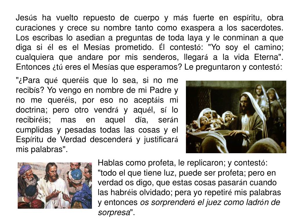 Jesús ha vuelto repuesto de cuerpo y más fuerte en espíritu, obra curaciones y crece su nombre tanto como exaspera a los sacerdotes. Los escribas lo asedian a preguntas de toda laya y le conminan a que diga si él es el Mesías prometido. Él contestó: "Yo soy el camino; cualquiera que andare por mis senderos, llegará a la vida Eterna". Entonces ¿tú eres el Mesías que esperamos? Le preguntaron y contestó: "¿Para qué queréis que lo sea, si no me recibís? Yo vengo en nombre de mi Padre y no me queréis, por eso no aceptáis mi doctrina; pero otro vendrá y aquél, sí lo recibiréis; mas en aquel día, serán cumplidas y pesadas todas las cosas y el Espíritu de Verdad descenderá y justificará mis palabras". Hablas como profeta, le replicaron; y contestó: "todo el que tiene luz, puede ser profeta; pero en verdad os digo, que estas cosas pasarán cuando las habréis olvidado; pera yo repetiré mis palabras y entonces os sorprenderá el juez como ladrón de sorpresa".
