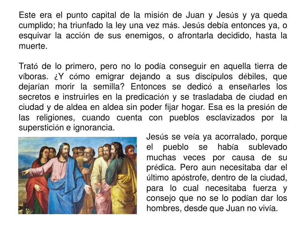Este era el punto capital de la misión de Juan y Jesús y ya queda cumplido; ha triunfado la ley una vez más. Jesús debía entonces ya, o esquivar la acción de sus enemigos, o afrontarla decidido, hasta la muerte. Trató de lo primero, pero no lo podía conseguir en aquella tierra de víboras. ¿Y cómo emigrar dejando a sus discípulos débiles, que dejarían morir la semilla? Entonces se dedicó a enseñarles los secretos e instruirles en la predicación y se trasladaba de ciudad en ciudad y de aldea en aldea sin poder fijar hogar. Esa es la presión de las religiones, cuando cuenta con pueblos esclavizados por la superstición e ignorancia. Jesús se veía ya acorralado, porque el pueblo se había sublevado muchas veces por causa de su prédica. Pero aun necesitaba dar el último apóstrofe, dentro de la ciudad, para lo cual necesitaba fuerza y consejo que no se lo podían dar los hombres, desde que Juan no vivía.
