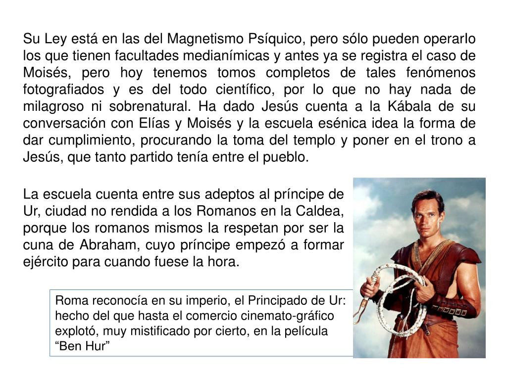 Su Ley está en las del Magnetismo Psíquico, pero sólo pueden operarIo los que tienen facultades medianímicas y antes ya se registra el caso de Moisés, pero hoy tenemos tomos completos de tales fenómenos fotografiados y es del todo científico, por lo que no hay nada de milagroso ni sobrenatural. Ha dado Jesús cuenta a la Kábala de su conversación con Elías y Moisés y la escuela esénica idea la forma de dar cumplimiento, procurando la toma del templo y poner en el trono a Jesús, que tanto partido tenía entre el pueblo. La escuela cuenta entre sus adeptos al príncipe de Ur, ciudad no rendida a los Romanos en la Caldea, porque los romanos mismos la respetan por ser la cuna de Abraham, cuyo príncipe empezó a formar ejército para cuando fuese la hora. Roma reconocía en su imperio, el Principado de Ur: hecho del que hasta el comercio cinemato-gráfico explotó, muy mistificado por cierto, en la película “Ben Hur”