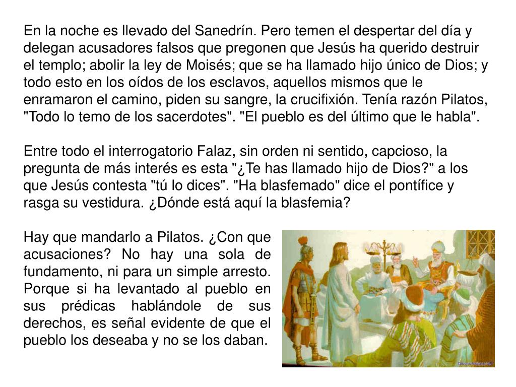 En la noche es llevado del Sanedrín. Pero temen el despertar del día y delegan acusadores falsos que pregonen que Jesús ha querido destruir el templo; abolir la ley de Moisés; que se ha llamado hijo único de Dios; y todo esto en los oídos de los esclavos, aquellos mismos que le enramaron el camino, piden su sangre, la crucifixión. Tenía razón Pilatos, "Todo lo temo de los sacerdotes". "El pueblo es del último que le habla". Entre todo el interrogatorio Falaz, sin orden ni sentido, capcioso, la pregunta de más interés es esta "¿Te has llamado hijo de Dios?" a los que Jesús contesta "tú lo dices". "Ha blasfemado" dice el pontífice y rasga su vestidura. ¿Dónde está aquí la blasfemia? Hay que mandarlo a Pilatos. ¿Con que acusaciones? No hay una sola de fundamento, ni para un simple arresto. Porque si ha levantado al pueblo en sus prédicas hablándole de sus derechos, es señal evidente de que el pueblo los deseaba y no se los daban.