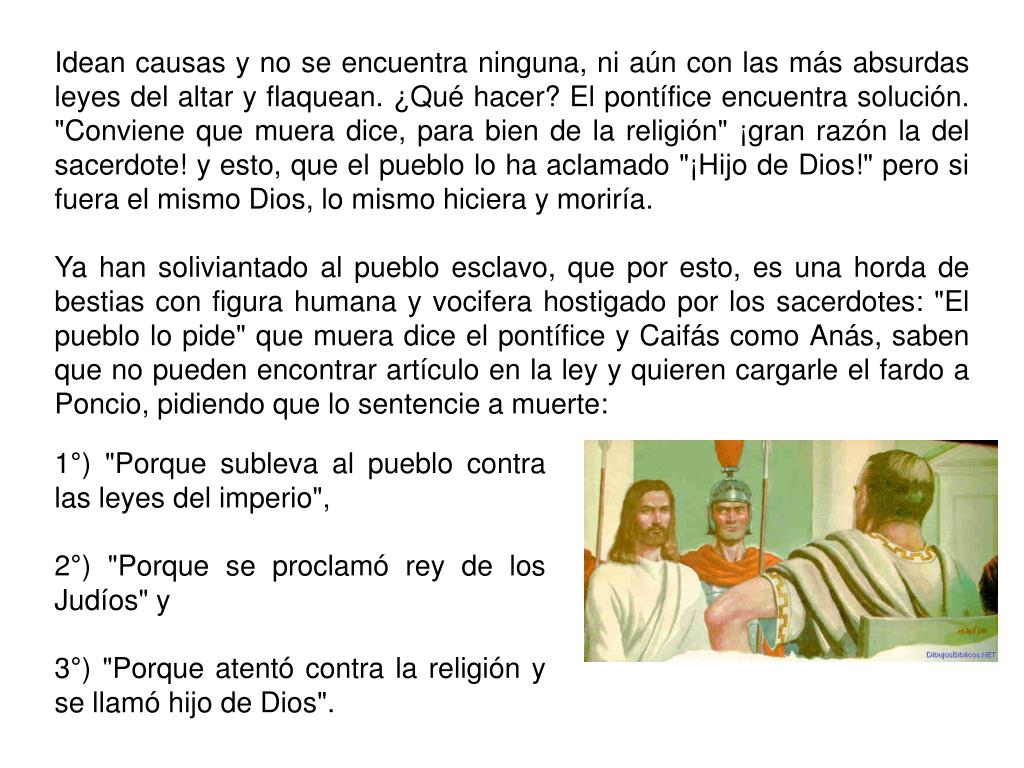 Idean causas y no se encuentra ninguna, ni aún con las más absurdas leyes del altar y flaquean. ¿Qué hacer? El pontífice encuentra solución. "Conviene que muera dice, para bien de la religión" ¡gran razón la del sacerdote! y esto, que el pueblo lo ha aclamado "¡Hijo de Dios!" pero si fuera el mismo Dios, lo mismo hiciera y moriría. Ya han soliviantado al pueblo esclavo, que por esto, es una horda de bestias con figura humana y vocifera hostigado por los sacerdotes: "El pueblo lo pide" que muera dice el pontífice y Caifás como Anás, saben que no pueden encontrar artículo en la ley y quieren cargarle el fardo a Poncio, pidiendo que lo sentencie a muerte: 1°) "Porque subleva al pueblo contra las leyes del imperio", 2°) "Porque se proclamó rey de los Judíos" y 3°) "Porque atentó contra la religión y se llamó hijo de Dios".