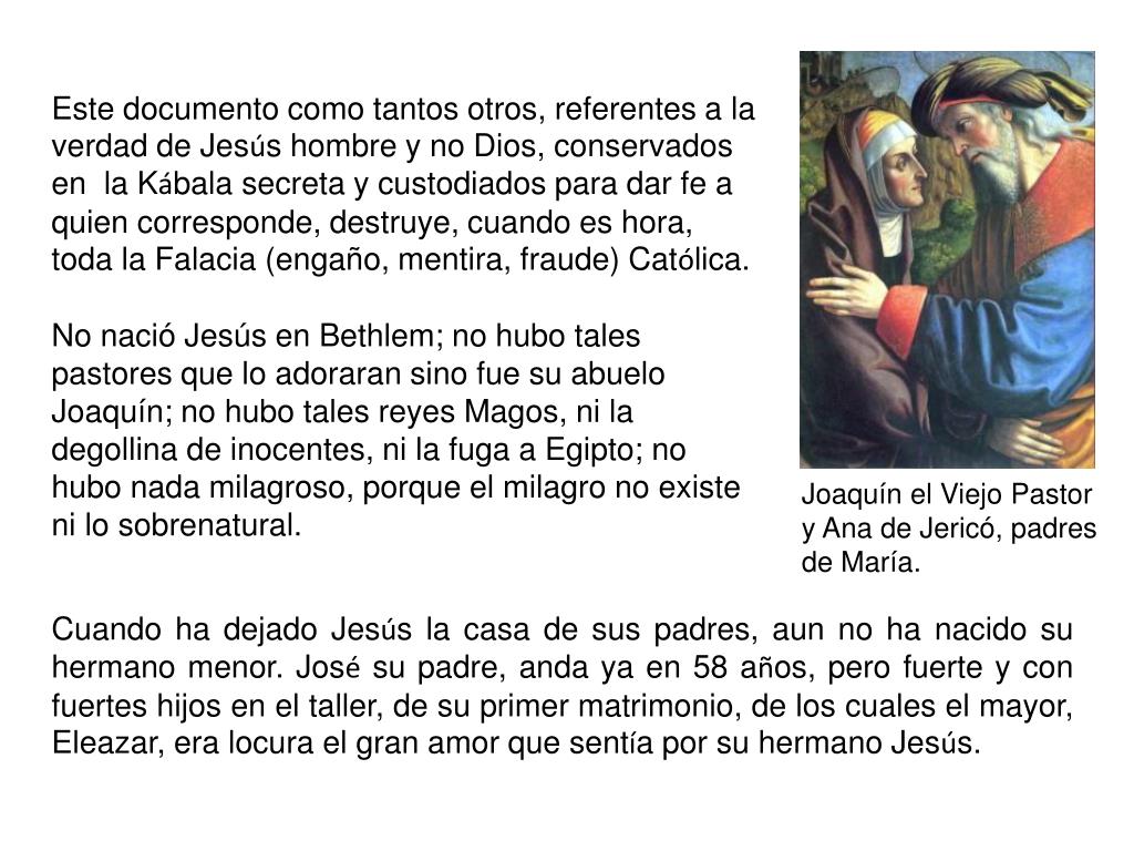 Este documento como tantos otros, referentes a la verdad de Jesús hombre y no Dios, conservados en la Kábala secreta y custodiados para dar fe a quien corresponde, destruye, cuando es hora, toda la Falacia (engaño, mentira, fraude) Católica. No nació Jesús en Bethlem; no hubo tales pastores que lo adoraran sino fue su abuelo Joaquín; no hubo tales reyes Magos, ni la degollina de inocentes, ni la fuga a Egipto; no hubo nada milagroso, porque el milagro no existe ni lo sobrenatural. Joaquín el Viejo Pastor y Ana de Jericó, padres de María. Cuando ha dejado Jesús la casa de sus padres, aun no ha nacido su hermano menor. José su padre, anda ya en 58 años, pero fuerte y con fuertes hijos en el taller, de su primer matrimonio, de los cuales el mayor, Eleazar, era locura el gran amor que sentía por su hermano Jesús.