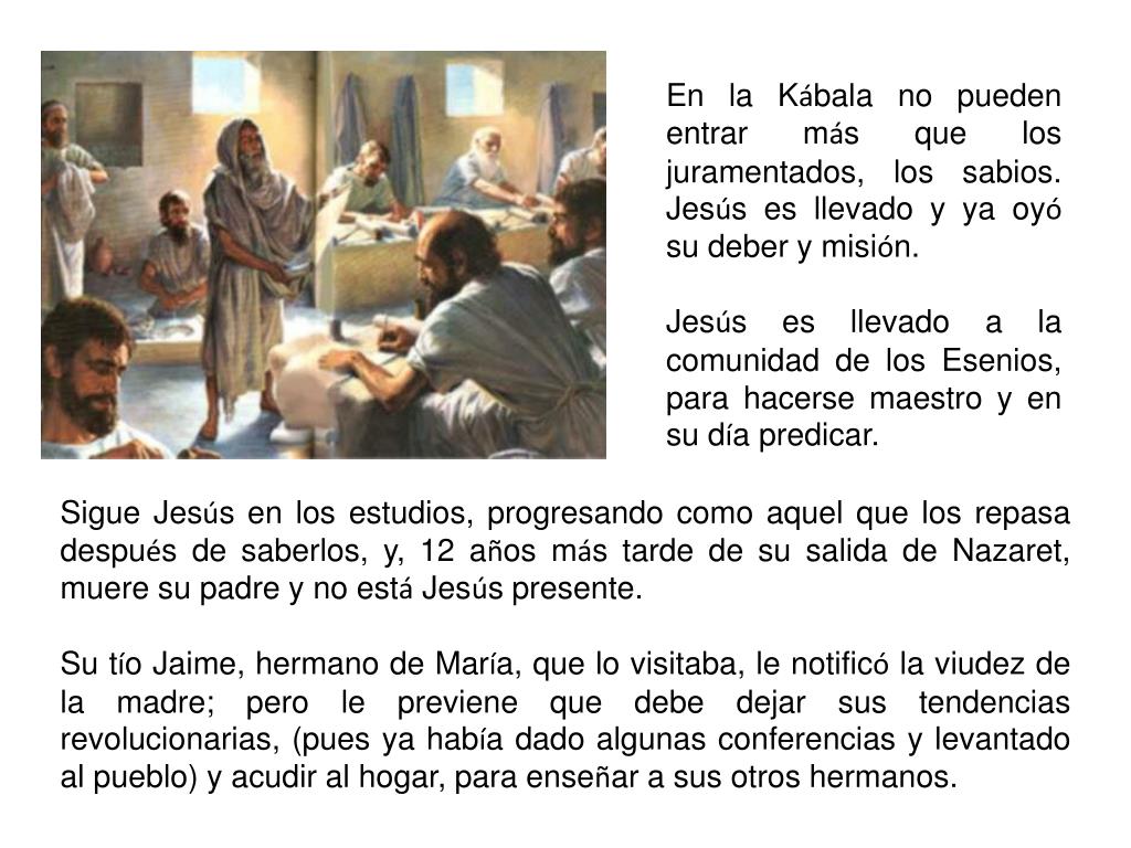 En la Kábala no pueden entrar más que los juramentados, los sabios. Jesús es llevado y ya oyó su deber y misión. Jesús es llevado a la comunidad de los Esenios, para hacerse maestro y en su día predicar. Sigue Jesús en los estudios, progresando como aquel que los repasa después de saberlos, y, 12 años más tarde de su salida de Nazaret, muere su padre y no está Jesús presente. Su tío Jaime, hermano de María, que lo visitaba, le notificó la viudez de la madre; pero le previene que debe dejar sus tendencias revolucionarias, (pues ya había dado algunas conferencias y levantado al pueblo) y acudir al hogar, para enseñar a sus otros hermanos.
