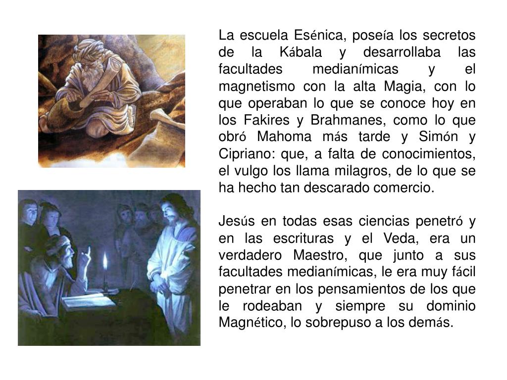 La escuela Esénica, poseía los secretos de la Kábala y desarrollaba las facultades medianímicas y el magnetismo con la alta Magia, con lo que operaban lo que se conoce hoy en los Fakires y Brahmanes, como lo que obró Mahoma más tarde y Simón y Cipriano: que, a falta de conocimientos, el vulgo los llama milagros, de lo que se ha hecho tan descarado comercio. Jesús en todas esas ciencias penetró y en las escrituras y el Veda, era un verdadero Maestro, que junto a sus facultades medianímicas, le era muy fácil penetrar en los pensamientos de los que le rodeaban y siempre su dominio Magnético, lo sobrepuso a los demás.