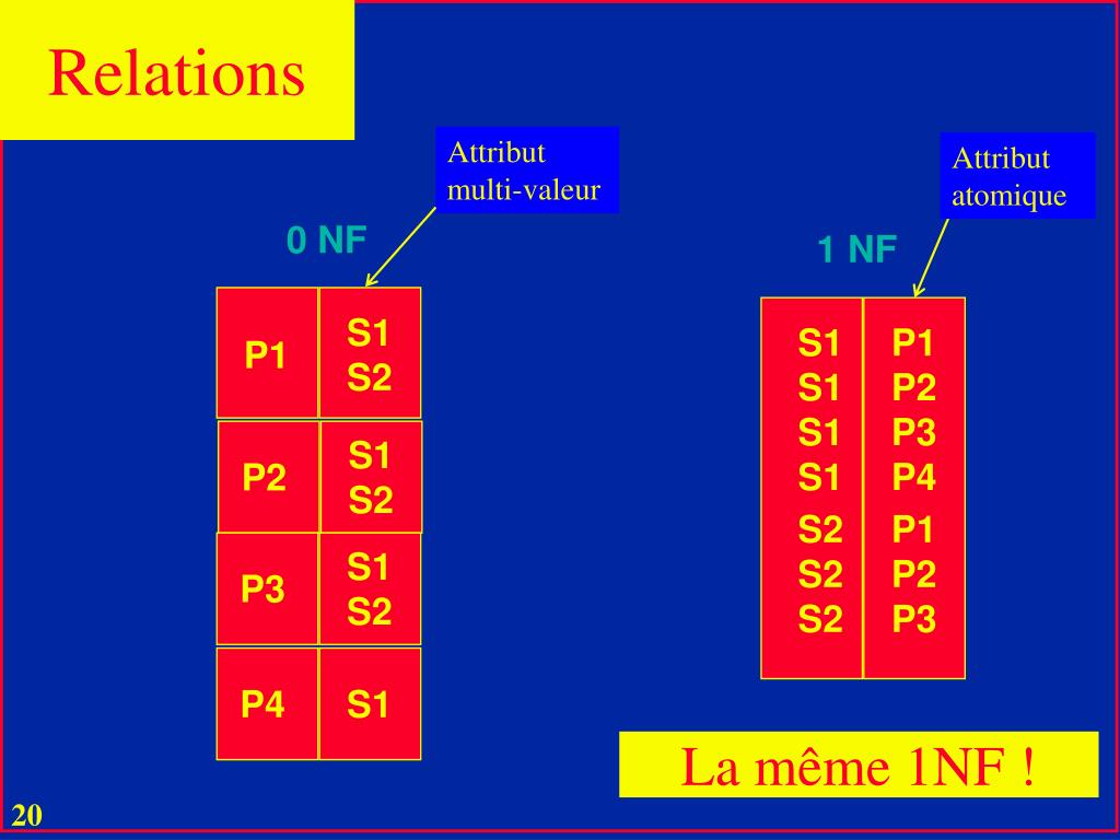 Relations Attribut multi-valeur Attribut atomique 0NF 1 NF P1 P2 P3 P4 S1 S1 S1 S1 P1 P2 P3 P4 S1 S2 S2 S2 P1 P2 P3 P1 P2 P3 S2