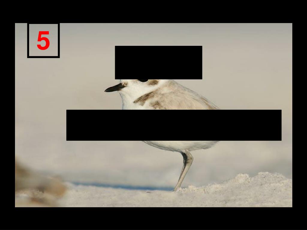 1. Fox Sparrow 2. Herring Gull 3. House Wren 4. Inca Dove 5. Peregrine Falcon 6. Piping Plover 7. Pomarine Jaeger 8. Royal Tern 9. Ruddy Turnstone 10. Sora 11. Tricolored Heron 12. White-eyed Vireo 2 2 the broad, messy breast band eliminates everything but Black-bellied and this species