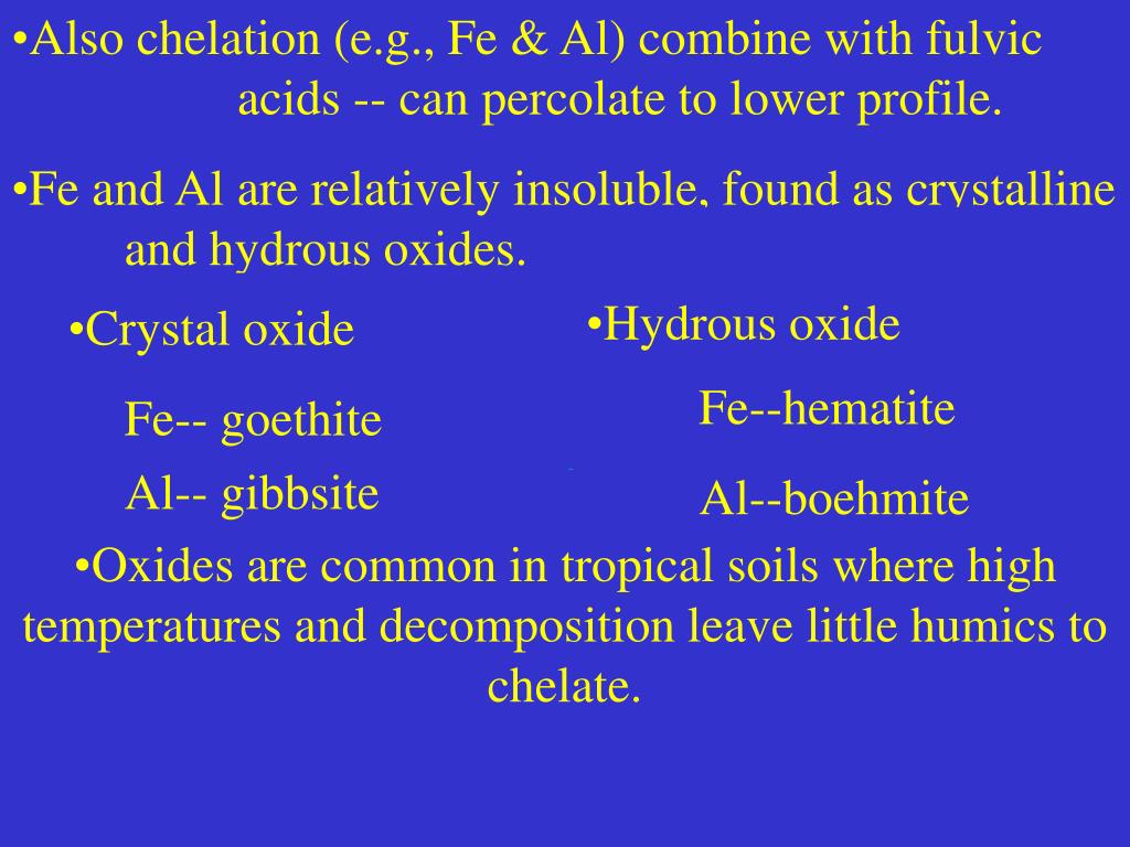 Also chelation (e.g., Fe & Al) combine with fulvic acids -- can percolate to lower profile. • Fe and Al are relatively insoluble, found as crystalline and hydrous oxides. • Hydrous oxide • Fe--hematite • Al--boehmite • Crystal oxide • Fe-- goethite • Al-- gibbsite • Oxides are common in tropical soils where high temperatures and decomposition leave little humics to chelate.