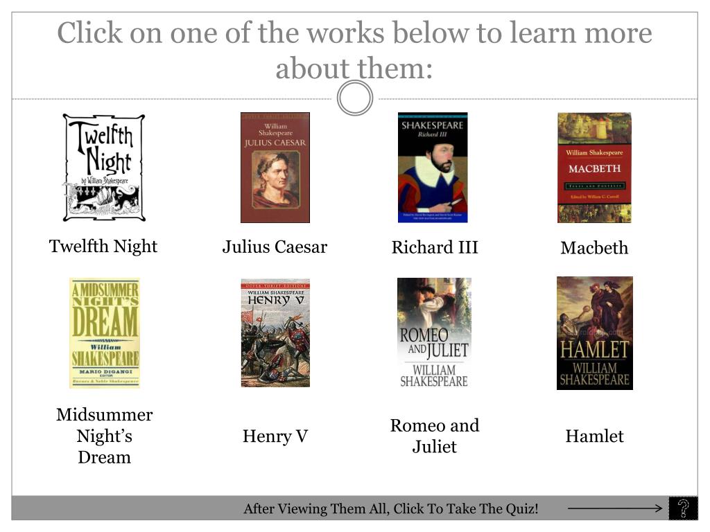 Click on one of the works below to learn more about them: Twelfth Night Julius Caesar Richard III Macbeth Midsummer Night’s Dream Romeo and Juliet Hamlet Henry V After Viewing Them All, Click To Take The Quiz!
