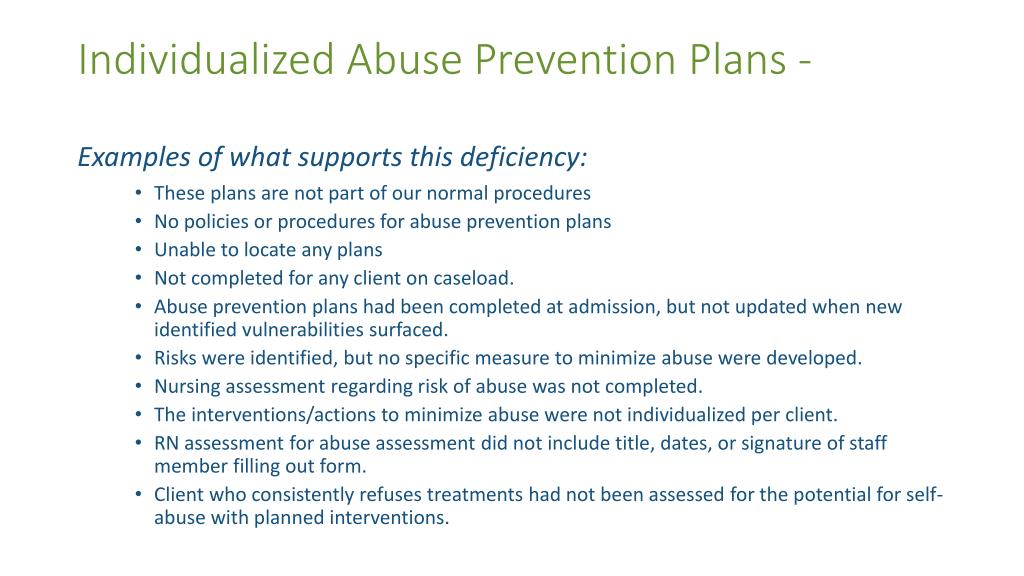 Individualized Abuse Prevention Plans - Examples of what supports this deficiency: • These plans are not part of our normal procedures • No policies or procedures for abuse prevention plans • Unable to locate any plans • Not completed for any client on caseload. • Abuse prevention plans had been completed at admission, but not updated when new identified vulnerabilities surfaced. • Risks were identified, but no specific measure to minimize abuse were developed. • Nursing assessment regarding risk of abuse was not completed. • The interventions/actions to minimize abuse were not individualized per client. • RN assessment for abuse assessment did not include title, dates, or signature of staff member filling out form. • Client who consistently refuses treatments had not been assessed for the potential for self-abuse with planned interventions.
