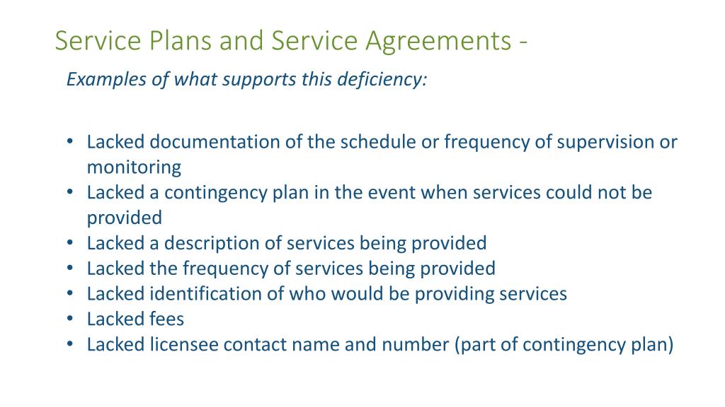 Examples of what supports this deficiency: • Lackeddocumentationofthescheduleorfrequencyofsupervisionormonitoring • Lackedacontingencyplanintheeventwhenservicescouldnotbeprovided • Lackedadescriptionofservicesbeingprovided • Lackedthefrequencyofservicesbeingprovided • Lackedidentificationofwhowouldbeprovidingservices • Lackedfees • Lacked licenseecontactnameandnumber(partofcontingencyplan) Service Plans and Service Agreements -