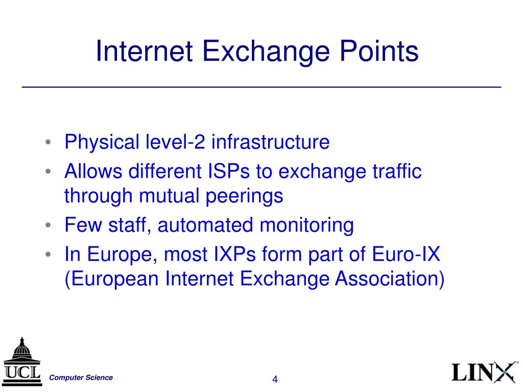 Internet Exchange Points • Physical level-2 infrastructure • Allows different ISPs to exchange traffic through mutual peerings • Few staff, automated monitoring • In Europe, most IXPs form part of Euro-IX (European Internet Exchange Association)