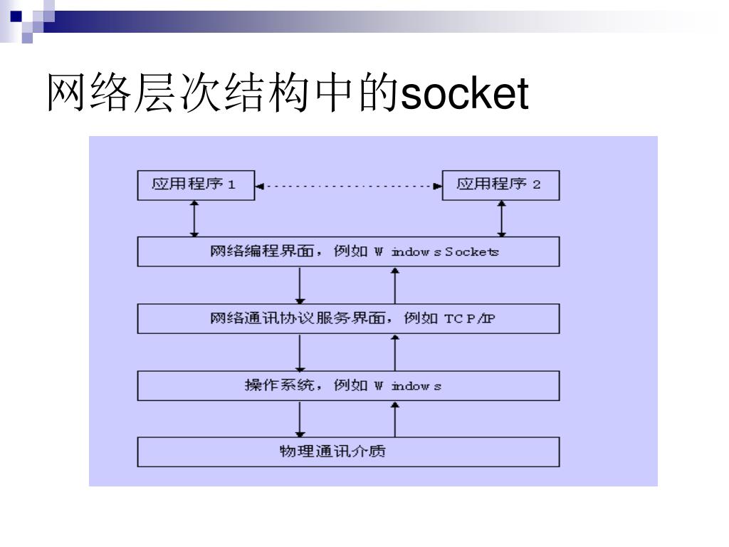 Socket原理 • Socket通常称为套接字、套管、插口,是两个程序间通信链路的端点。 • Socket实际上是一个编程接口,为网络应用程序提供各种接口函数。
