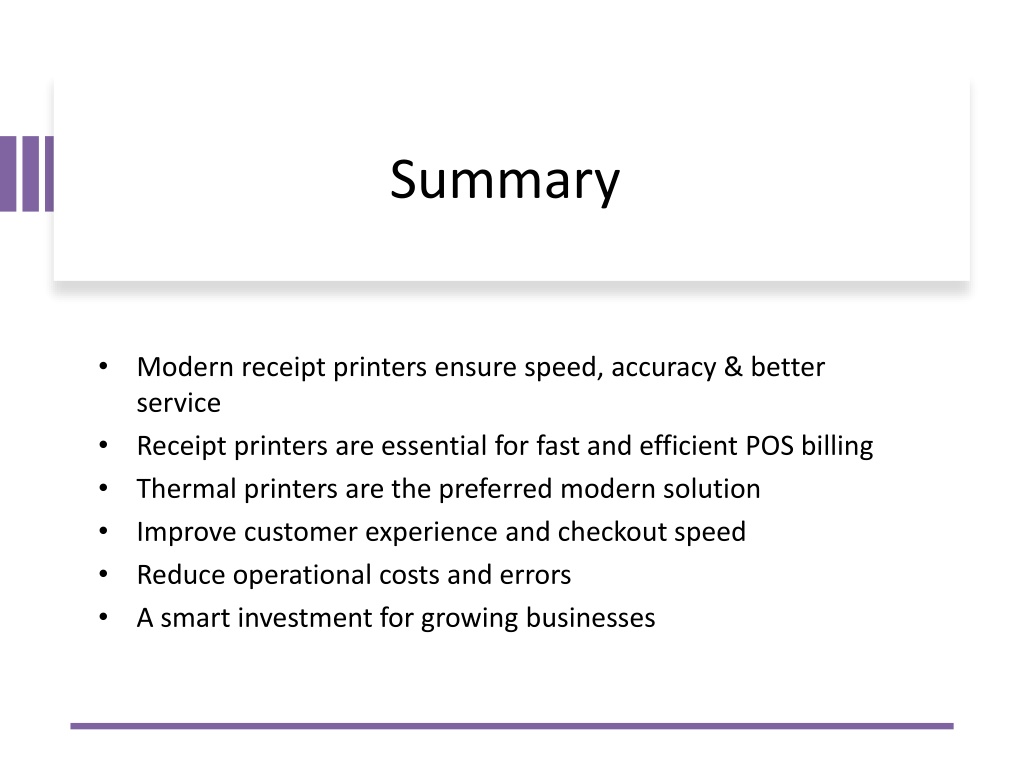 Summary • Modern receipt printers ensure speed, accuracy & better service • Receipt printers are essential for fast and efficient POS billing • Thermal printers are the preferred modern solution • Improve customer experience and checkout speed • Reduce operational costs and errors • A smart investment for growing businesses