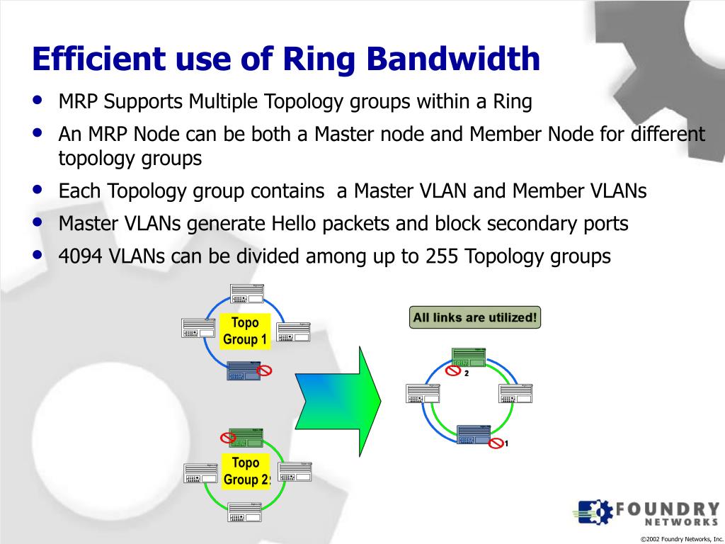 MRP – Summary of Benefits • Fast, sub-second, predictable fail-over functionality • Maximizes ring bandwidth utilization • Cost effective scalable solution for MAN resiliency • Attractive alternative to STP • Utilizes 802.3 Ethernet Packet standards and MACs • Can be combined with other Foundry features to provide complete end to end MAN designs