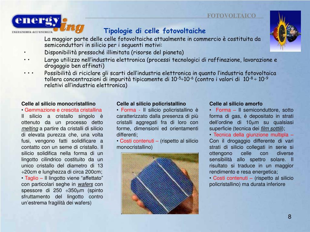 FOTOVOLTAICO Tipologie di celle fotovoltaiche La maggior parte delle celle fotovoltaiche attualmente in commercio è costituita da semiconduttori in silicio per i seguenti motivi: • Disponibilità pressoché illimitata (risorse del pianeta) • • Largo utilizzo nell’industria elettronica (processi tecnologici di raffinazione, lavorazione e drogaggio ben affinati) • • • Possibilità di riciclare gli scarti dell’industria elettronica in quanto l’industria fotovoltaica tollera concentrazioni di impurità tipicamente di 10-5÷10-6 (contro i valori di 10-8 ÷ 10-9 relativi all’industria elettronica) Celle al silicio monocristallino • Gemmazione e crescita cristallina Il silicio a cristallo singolo è ottenuto da un processo detto melting a partire da cristalli di silicio di elevata purezza che, una volta fusi, vengono fatti solidificare a contatto con un seme di cristallo. Il silicio solidifica nella forma di un lingotto cilindrico costituito da un unico cristallo del diametro di 13 ÷20cm e lunghezza di circa 200cm; • Taglio – Il lingotto viene “affettato” con particolari seghe in wafers con spessore di 250 ÷350m (spinto sfruttamento del lingotto contro un’estrema fragilità dei wafers) Celle al silicio policristallino • Forma - Il silicio policristallino è caratterizzato dalla presenza di più cristalli aggregati fra di loro con forme, dimensioni ed orientamenti differenti; • Costi contenuti – (rispetto al silicio monocristallino) Celle al silicio amorfo • Forma – Il semiconduttore, sotto forma di gas, è depositato in strati dell’ordine di 10m su qualsiasi superficie (tecnica dei film sottili); • Tecnica della giunzione multipla – Con il drogaggio differente di vari strati di silicio collegati in serie si ottengono celle con diverse sensibilità allo spettro solare. Il risultato si traduce in un maggior rendimento e resa energetica; • Costi contenuti – (rispetto al silicio policristallino) ma durata inferiore